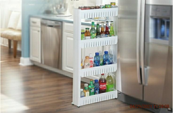 描述 : 四層可移動隙縫收納置物架,節省地方,可放置各種調味料,飲品 ,沐浴露等